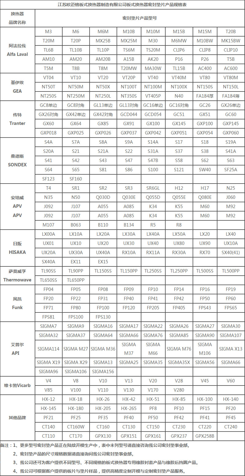 江蘇歐邁格板式換熱器制造有限公司國產(chǎn)板式換熱器密封墊片產(chǎn)品規(guī)格表